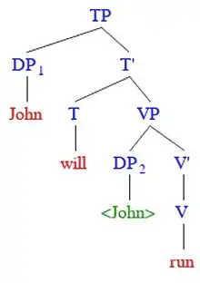 In order to satisfy the EPP we must move the DP John into spec TP, to allow for the TP subject to be filled[6] By moving the DP we are altering the sentence making it John will Run. The EPP will now be satisfied as the DP John is now in the subject position of the TP.[4]