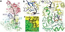 - 1 2 3 Huang CS, Sadre-Bazzaz K, Shen Y, Deng B, Zhou ZH, Tong L (August 2010). "Crystal structure of the alpha(6)beta(6) holoenzyme of propionyl-coenzyme A carboxylase". Nature. 466 (7309): 1001–1005. doi:10.1038/nature09302. PMC 2925307. PMID 20725044.