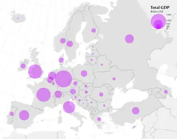 This map uses countries (aggregation districts), the variable is gross domestic product (spatially extensive, ratio, total amount), the symbols are transparent circles, and a nested legend. It is intended to clearly show the concentration of economic activity in Europe.