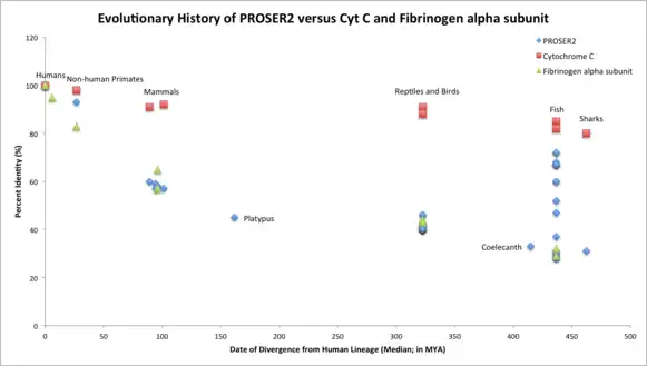 The evolutionary history of PROSER2 versus Cytochrome C and Fibrinogen alpha subunit. Each data point on the graph represents a homolog of the human gene found in a different species that was found using a BLAST search. This search resulted in percent identities which are graphed against the estimated time of divergence from humans which was found using TimeTree.This graph demonstrates that PROSER2 is a fast-evolving gene, similar to the Fibrinogen alpha subunit.[25][26]