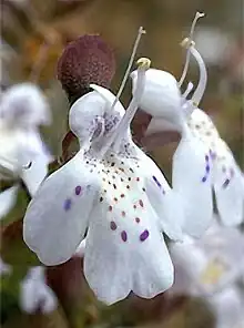 Prostanthera prostantheroides is a small shrub that typically grows to a height of up to 50 cm (20 in) and has stems that become spiny with age. The leaves are heart-shaped to round, 1–4 mm (0.039–0.157 in) long and about 1 mm (0.039 in) wide on a very short petiole. The flowers are arranged at the ends of the branches on pedicels 1–4 mm (0.039–0.157 in) long with bracteoles 3–4 mm (0.12–0.16 in) long at the base but that fall off as the flower develops. The sepals form a tube 3–3.5 mm (0.12–0.14 in) long with two lobes, the upper lobe about 3.5 mm (0.14 in) wide and the lower lobe about 3 mm (0.12 in) wide. The petals are 8–15 mm (0.31–0.59 in) long, white with purple, mauve to violet or red spots inside, and form a tube about 7 mm (0.28 in) long. The lower middle lobe is about 5 mm (0.20 in) wide and the side lobes are about 4 mm (0.16 in) long and 3 mm (0.12 in) wide, the upper lobes 3–3.5 mm (0.12–0.14 in) long and 2–2.5 mm (0.079–0.098 in) wide. Flowering occurs in August, September or October.[2][3]
