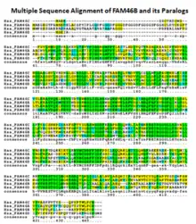 FAM46B has three paralogs in Homo sapiens: FAM46A, FAM46C, and FAM46D.[7] Multiple sequence alignments of the four members of the FAM46 show high levels of conservation particularly toward the C-terminus. Amino acids conserved in all four paralogs indicate residues which make up the core of the FAM46 family.