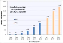 Bar chart showing growth over time of protein structures deposited by the Protein Structure Initiative into the Protein Data Bank