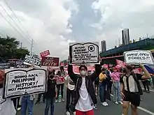 Protests against President Bongbong Marcos have occurred mainly in the Philippines even before[1] the inauguration of the president on June 30, 2022. Protest have been mostly conducted by progressive and opposition groups due to the violent and plunderous legacy of the Marcos family during the martial law era and throughout the rule of his father, former President Ferdinand Marcos;[2] unpaid real-estate taxes;[1] alleged electoral fraud during the 2022 presidential elections;[1] instances of fake news and historical distortion;[1] cases of human rights violations such as extra-judicial killings and the continuing war on drugs;[3] and other social issues.[4][5] Protests against the president have also included grievances against Vice President Sara Duterte[6] as well as seeking of accountability from his predecessor Rodrigo Duterte.[7] Mobilizations have also been held by Filipino-Americans and other solidarity and progressive groups abroad such as in United States, Australia, and Canada.[5]