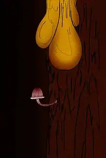 The holotype of Protomycena is a single fruit body without any associated structures, preserved in a piece of clear light yellow polished amber approximately 4.5–2.5 cm (1.77–0.98 in) wide. The pileus is 5 mm (0.2 in) in diameter and has a convex shape, sporting a raised central region (an umbo). The pale flesh appears yellowish in the amber, and is smooth and glossy, changing to striate and slightly translucent towards the margin. The pileus margin is striated and slightly flared. The gills on the underside of the pileus are broadly attached (adnate) to the top of the stipe, and distantly spaced—between six and eight gills extend completely from the pileus margin to the stipe. These full-length gills are anastomosed with lamellulae (short gills which do not reach the edge of the stipe from the pileus margin) of varying lengths.[2] The pileus is centered on the curved stipe, which is smooth and cylindrical, measuring 0.75 mm (0.030 in) thick by 10 mm (0.39 in) long. The stipe lacks a ring and rhizoids. The mushroom is preserved with a small liquid and gas-filled bubble, possibly originating from the mushroom itself, which indicates the amber to be very solid and well-sealed.[1]