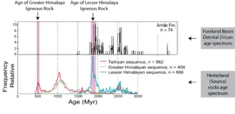 The figure to the right is an example of U–Pb relative age probability diagram.[16] The upper plot shows foreland basin detrital zircon age distribution. The lower plot shows hinterland (source area) zircon age distribution. In the plots, n is the number of analyzed zircon grains. So for foreland basin Amile formation, 74 grains are analyzed. For source area (divided into 3 tectonic level, Tethyan Himalaya, Greater Himalaya and Lesser Himalaya), 962, 409 and 666 grains are analyzed respectively. To correlate hinterland and foreland data, let's see the source area record first, Tethyan sequence have age peak at ~500 Myr, 1000 Myr and 2600 Myr, Greater Himalaya has age peaks at ~1200 Myr and 2500 Myr, and Lesser Himalaya sequence has age peaks at ~1800 Ma and 2600 Ma. By simply comparing the foreland basin record with source area record, we cam see that Amile formation resemble age distribution of Lesser Himalaya. It has about 20 grains with age ~1800 Myr (Paleoproterozoic) and about 16 grains yield age of ~2600 Myr (Archean). Then we can interpret that sediments of Amile formation are mainly derived from the Lesser Himalaya, and rocks yield ago of Paleoproterozoic and Archean are from the Indian craton. So the story is: Indian plate collide with Tibet, rocks of Indian craton deformed and involved into Himalayan thrust belt (e.g. Lesser Himalaya sequence), then eroded and deposited at foreland basin.