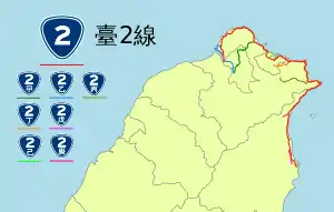 Provincial Highway No. 2 (台2線) is an east-west, 167.674 km-long provincial Taiwanese highway that starts from the border of Taipei and Tamsui and ends in Su'ao, Yilan. Although designed as an east-west route, the highway actually goes in north-south direction in Yilan County and parts of New Taipei City. The highway serves as the primary road for the north coast cities in Taiwan.