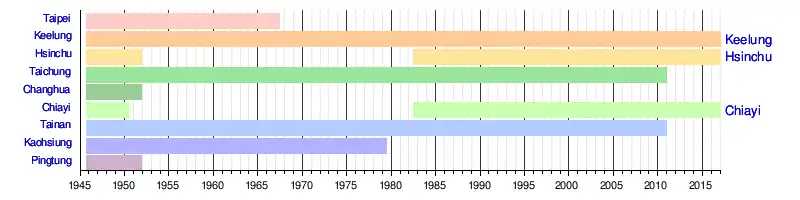 | 1945-10 | Changhua, Chiayi, Hsinchu, Kaohsiung, Keelung, Pingtung, Taichung, Tainan, Taipei[4] | 9 | Reorganised from the prefecture-administered cities in the period under Japanese rule. | |