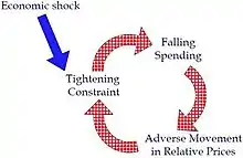 Such a problem of excessive borrowing rooted on the pecuniary externality and market incompleteness can be much more severe when some financial amplification mechanism is present:[11][12][13] For example, some negative shocks on the aggregate demand could lead to the real depreciation and the fall of domestic asset prices, which brings about the incipient adverse balance sheet effects that decrease the firm net worth and value of collateral. Consequently, the shrink of collateral value further constrains the private agents’ accesses to external borrowing through the binding borrowing constraint, which in turn results in the economy-wise spending cut and initial aggregate demand contraction is thus amplified. As shown in the graph depicting such a loop of effects, it is even striking that adverse shock on any step of this feedback loop could trigger this amplification of initial negative effects. Hence the overly large inflow of capital would potentially create a systemic risk and activate the amplification mechanism, which ultimately would generate large business cycle volatility, sudden collapse of the financial system and the economic recessions only given such a small incipient adverse shock on the feedback loop.[2]