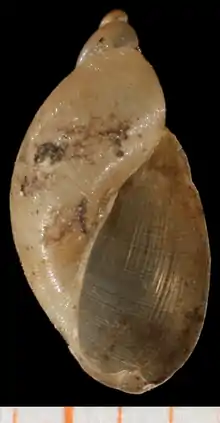 Pseudosuccinea columella , the American ribbed fluke snail, is a species of air-breathing freshwater snail, an aquatic pulmonate gastropod mollusk in the family Lymnaeidae, the pond snails.