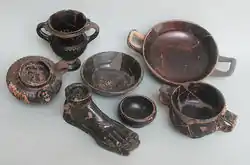 Room 1 stands out for its sacred character.[9] An infant burial was located under the floor. The room also contained a large hearth with impressive paving and the highest proportion of imported Black Gloss ceramics (from Campania and Attica). Amongst the imported and local ceramics were small vases and jars for pouring libations, incense burners in the shape of the head of a goddess, lamps and many cups. The room also had a large esparto mat, an iron key, and a set of weights with a balance. The room contained more common items as well, such as loom weights, spindle whorls and large storage containers. On the other hand, no cooking ware was found in the room. In the next room (2) was an area for separating silver from lead, along with evidence for textile manufacture and cooking. In recent work, the authors have proposed that there is a gendering of the space, with ritual activities, cupellation, weaving, cooking and domestic administration being in female hands in rooms 1 and 2 while room 4 on the opposite side of the street was associated with male activities as indicated by the martial and agricultural tools found inside.[9]