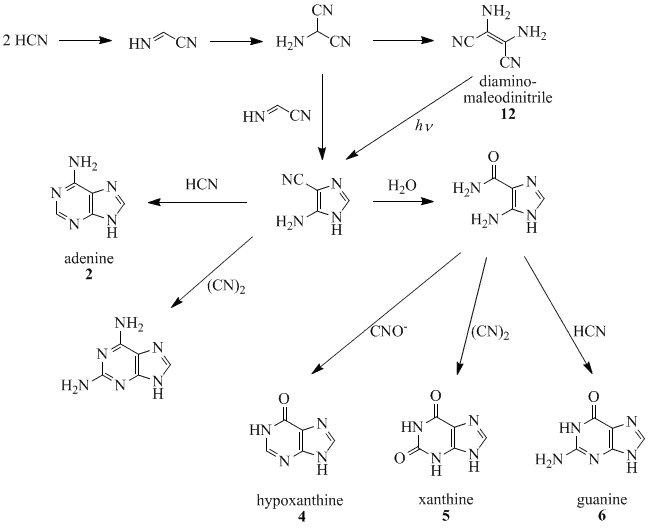 Oro, Orgel and co-workers have shown that four molecules of HCN tetramerize to form diaminomaleodinitrile (12), which can be converted into almost all naturally occurring purines.[20][21][22][23][24] For example, five molecules of HCN condense in an exothermic reaction to make adenine, especially in the presence of ammonia.