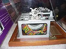 The United States obtained portions of a Purple machine from the Japanese Embassy in Germany following Germany's defeat in 1945 (see image above) and discovered that the Japanese had used a stepping switch almost identical in its construction to the one Leo Rosen of SIS had chosen when building a duplicate (or Purple analog machine) in Washington in 1939 and 1940. The stepping switch was a uniselector; a standard component used in large quantities in automatic telephone exchanges in countries like America, Britain, Canada, Germany and Japan, with extensive dial-telephone systems. The U.S. used four 6-level switches in each stage of its Purple analogs,[5] the Japanese used three 7-level switches. Both represented the 20s cipher identically. Note however that these were not two-motion or Strowger switches as sometimes claimed: "twenty-five Strolger-type (sic) stepper switches ...".[9]