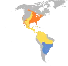 Being migratory, their breeding range extends from central Alberta down through the eastern United States. Subspecies breed in Baja California, Arizona, and New Mexico. Most make a brief stopover in the Yucatán Peninsula or Cuba during pre-breeding migration to North America and during post-breeding migration before reaching their overwintering site in South America.[3]