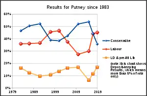 Putney was the first Conservative gain on election night in 2005, when Justine Greening took back the seat from Labour on a two-party swing (Lab-Con) of 6.5%. The 2015 result gave the seat the 148th most marginal majority of the Conservative Party's 331 seats by percentage of majority, similar to the 2010 result.[6] The 2017 election saw Greening re-elected, but with a 10% swing to Labour; this heavy swing against the Conservatives has been attributed to the fact that the Borough of Wandsworth (of which Putney is part) voted 75% in favour of remaining in the European Union in the previous year's referendum. In 2019, Putney was the only seat in the country gained by Labour.[7]