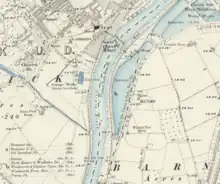 Prior to construction of the reservoir it was meadowland by the riverside, known as Westmead or Lotmead, as it was divided into 'lots' of land. It formed a parish exclave of Putney, surrounded by the parish of Barnes. It was also known as Putney detached.[4] The land was purchased by the West Middlesex Waterworks Company and the reservoir was built in 1838. Putney became part of the County of London in 1889 which caused the detached part to become a county exclave surrounded by Surrey. The London Government Act 1899 made provision for this and Putney detached was transferred to the parish of Barnes on 1 April 1901.[5]