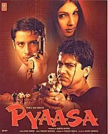 Pyaasa (transl. eternally thirsty) is a 2002 Indian Hindi-language film directed by A. Muthu. The film tells the story of Suraj (Aftab Shivdasani), a young man, full of dreams, aspirations, desire, but no money. He is desperate for money. He meets the anchor of his life, Sheetal Oberoi (Yukta Mookhey in her first major leading role in Hindi cinema), boss of a Mega Corporate company, who has a lot of money with her.[1][2]