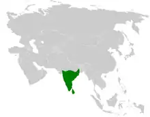This species is endemic to southern India and Sri Lanka. The northern boundary occurs across Gujarat, Madhya Pradesh and western West Bengal (near Midnapur[8]). It is found in dry open scrub country mainly on the plains and also occurs in gardens and woodlands with dense shrubbery.[4]