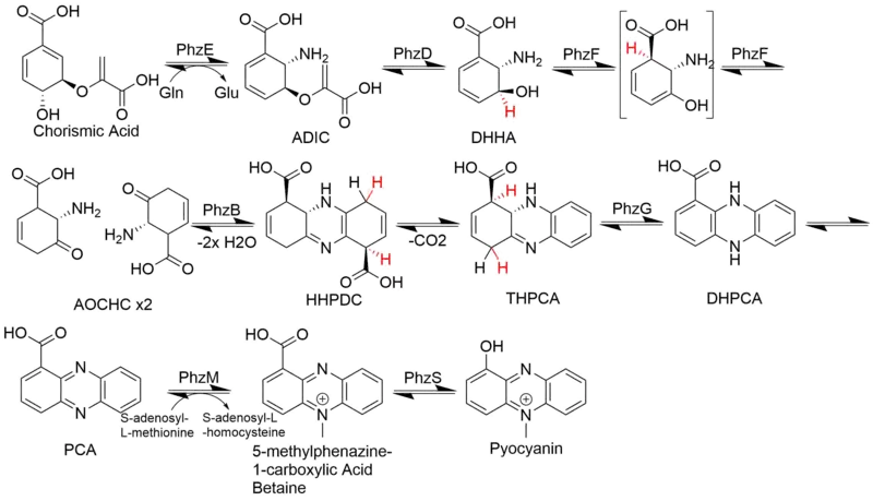 Pyocyanin biosynthesis begins with the synthesis of the phenazine-1-carboxylic acid (PCA) core.[5] In this reaction the enzyme PhzE catalyzes the loss of the hydroxyl group from C4 of Chorismic Acid as well as the transfer of an amine group from glutamine to form glutamic acid and 2-amino-2-desoxyisochorismic acid (ADIC).[6] Following this, PhzD catalyzes the hydrolytic removal the pyruvate moiety from ADIC to form (5S,6S)-6-amino-5-hydroxy-1,3-cyclohexadieve-1-carboxylic acid (DHHA).[6] In the next step, PhzF catalyzes two steps: the abstraction of a hydrogen from C3 of DHHA, delocalization of the double bond system and reprotonation at C1 as well as enol tautomerization to form the highly unstable 6-amino-5-oxocyclohex-2-ene-1-carboxylic acid (AOCHC).[6] From here two molecules of AOCHC are condensed by PhzB to form the tricyclic compound, hexahydrophenazine-1,6-dicarboxylic acid (HHPDC).[6] The product of this reaction, HHPDC, is unstable and spontaneously undergoes oxidative decarboxylation in an uncatalyzed reaction to form tetrahydrophenazine-1,6-carboxylic acid (THPCA).[6] In the final step of phenazine-1-carboxylic acid synthesis the enzyme PhzG catalyzes the oxidation of THPCA to dihydro-phenazine-1-carboxylic acid.[6] This is the last catalyzed step in the production of PCA, the last step is an uncatalyzed oxidation of DHPCA to PCA.[6] The conversion of PCA to Pyocyanin is achieved in two enzymatic steps: firstly, PCA is methylated on N5 to 5-methylphenazine-1-carboxylate betaine by the enzyme PhzM using the cofactor S-adenosyl-L-methionine and secondly, PhzS catalyzes the hydroxylative decarboxylation of this substrate to form the final product, Pyocyanin.[5]
