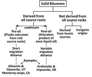- ↑ J. A. Curiale, Origin of solid bitumens, with emphasis on biological marker results, Org. Geochem. Vol. 10, pp. 559-580, 1986.