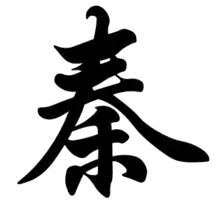 According to the Shuowen Jiezi, the character for Qin is a compound ideogram which combined two characters: chong 舂 "to pound", and he 禾 "grain".[2] The character originally refers to Qin Valley (秦谷) in Longxi near Tianshui, Gansu and became the name of that area. The area was granted to Feizi, a descendants of Gao Tao, by King Xiao of Zhou as a fief in the 9th century BC, which then grew into the state of Qin. In the 3rd century BC, the state of Qin unified China and became the first imperial dynasty under Qin Shi Huang. After the fall of the dynasty in 206 BC, the descendants of Qin royalty, whose ancestral name was Yíng (Chinese: 嬴), was said to have adopted the surname Qin.[1] Many people sought to identify themselves with the Qin long since the fall of the Qin dynasty; in Japan, the Hata clan of Japan claims descent from a branch of the Qin royal family, "Hata" being the native Japanese reading for the character "Qin".[3]