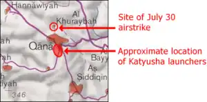 The IDF did not release footage of the airstrike itself, but did release a video it said was taken some time before the incident showing Katyusha rockets being fired southwest of Qana. The video also showed rocket launchers being hidden in buildings but the buildings were not identified as being in Qana as was reported.[59] On August 6, the BBC News reported that in a second attack in Qana, the IDF destroyed the Hezbollah rocket launchers in the village used against targets in Haifa, Israel.[60]