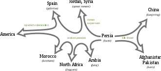 A cotton species, Gossypium arboreum, is indigenous to South Asia and has been cultivated on the Indian subcontinent for a long time. Cotton appears in the Inquiry into Plants by Theophrastus and is mentioned in the Laws of Manu.[15] As transregional trade networks expanded and intensified, cotton spread from its homeland to India and into the Middle East. One theory is that the qanat was developed to irrigate cotton fields,[16] first in what is now Iran, where it doubled the amount of available water for irrigation and urban use.[17] Because of this, Persia enjoyed larger surpluses of agricultural products, thus increasing urbanization and social stratification.[18] The qanat technology subsequently spread from Persia westward and eastward.[6]