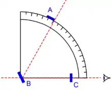 A quadrant is an instrument used to measure angles up to 90°. Different versions of this instrument could be used to calculate various readings, such as longitude, latitude, and time of day. Its earliest recorded usage was in ancient India in Rigvedic times by Rishi Atri to observe a solar eclipse.[1][2] It was then proposed by Ptolemy as a better kind of astrolabe.[3] Several different variations of the instrument were later produced by medieval Muslim astronomers. Mural quadrants were important astronomical instruments in 18th-century European observatories, establishing a use for positional astronomy.
