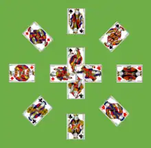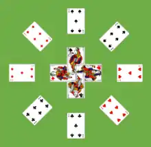 Meanwhile, in 1892, Professor Hoffmann described a different game called Quadrille in which the cards were built up in ascending sequence on Sixes and descending sequence on Fives, all laid out in a star shape.[3] The Queens were removed from the pack at the outset and placed decoratively within the star. This version subsequently acquired the name Captive Queens.[lower-alpha 1] In this game the name describes the way the Queens are enclosed within the star formed by the foundations. Alluding to the name, Quadrille, but describing the rules for the later game, Parlett calls it as "a pleasant little pictorial which may be said to represent the dance of the cardboard court."[4] The wagon-wheel tableau looks like a quadrille dance from 18th-19th century Europe.[5][lower-alpha 2]