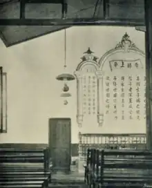After the communist takeover of China in 1949, Protestant churches in the country were forced to sever their ties with respective overseas churches, which has thus led to the merging of all the denominations into the communist-sanctioned Three-Self Patriotic Church.[27] The Jingfu meeting house was closed in the early 1950s after the expulsion of foreign missionaries. In 1953, more than 310 people from Lingxing, Liuying, Le'an and Xinde were converted by a Chinese missionary Lu Ruiyu (陸瑞玉) based at Lingxing. However, all church activities had ceased by 1956. It was not until 1980 that Protestantism was revived in Lingxing and Suhe, where there were relatively large numbers of Protestants. By the end of 1986, there were more than 1,200 officially registered Protestants in Santai County (formerly, Tongchuan). In 1987, more than 1,000 people gathered for Christmas service in Lingxing.[26]