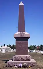At the age of 66, Quanah Parker died on February 23, 1911, at Star House.[21] In 1911, Quanah Parker's body was interred at Post Oak Mission Cemetery near Cache, Oklahoma.[22] In 1957, his remains were moved to Fort Sill Post Cemetery at Fort Sill, Oklahoma, along with his mother Cynthia Ann Parker and sister Topsannah ("Prairie Flower").[1] The inscription on his tombstone reads: