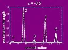 Recently there was a generalization of this formula for arbitrary matrix Hamiltonians that involves a Berry phase-like term stemming from spin or other internal degrees of freedom.[9] The index distinguishes the primitive periodic orbits: the shortest period orbits of a given set of initial conditions. is the period of the primitive periodic orbit and is its classical action. Each primitive orbit retraces itself, leading to a new orbit with action and a period which is an integral multiple of the primitive period. Hence, every repetition of a periodic orbit is another periodic orbit. These repetitions are separately classified by the intermediate sum over the indices . is the orbit's Maslov index. The amplitude factor, , represents the square root of the density of neighboring orbits. Neighboring trajectories of an unstable periodic orbit diverge exponentially in time from the periodic orbit. The quantity characterizes the instability of the orbit. A stable orbit moves on a torus in phase space, and neighboring trajectories wind around it. For stable orbits, becomes , where is the winding number of the periodic orbit. , where is the number of times that neighboring orbits intersect the periodic orbit in one period. This presents a difficulty because at a classical bifurcation. This causes that orbit's contribution to the energy density to diverge. This also occurs in the context of photo-absorption spectrum.