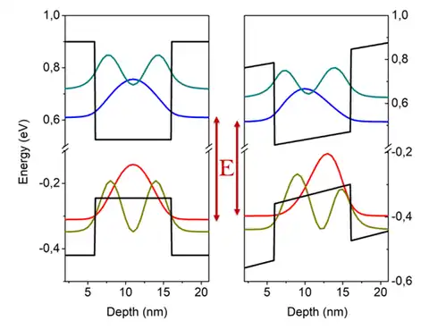 On the left: wave functions corresponding to the n=1 and n=3 levels in a quantum well with no applied electric field (). On the right: the perturbative effect of the applied electric field modifies the wave functions and decreases the energy of the n=1 transition.