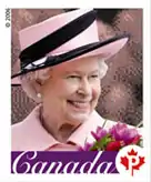 It was announced on September 19, 2006, that a series of new definitives would be issued in December of that year, as a non-denominated stamp, which will remain valid for domestic first class mail (up to 30g) through any future postal rate increases. The new series included a Queen stamp, which used a colour image taken during her tour to celebrate the centennials of Saskatchewan and Alberta. A "P" in the lower right-hand corner appears instead of a numerical value to indicate it is good for the basic domestic letter rate.[6] The second version of this stamp was issued on December 27, 2007, featuring an image of the Queen during her 2005 visit to Saskatchewan and Alberta.[7]