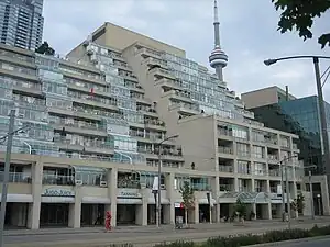 Queens Quay continues to go through a significant transformation. Originally, it served as an access road for the various ports and slips in the inner harbour. The street between Yonge Street and Parliament Street was home to storage buildings devoted to trade on the Saint Lawrence Seaway, major industries such as the Redpath Sugar Refinery and Victory Mills, as well as small commercial enterprises.[2] However, the mainly industrial uses along Queens Quay were slowly replaced by commercial and residential uses, mainly high-rise condominiums. Between 1975 and 1979, a cluster of large, concrete towers were erected at the foot of Bay Street, south of Queens Quay; these included the Westin Harbour Castle and Harbour Square. In 1990, the 40-storey York Quay towers were built and remain the tallest buildings on Queens Quay.[3] The scale and density of these and subsequent high-rise development along Queens Quay were criticized for blocking the lake and failing to provide a welcoming realm for visitors. In 1997 City School (Toronto) relocated to 635 Queens Quay West.[4] In 1999, the Toronto Transit Commission opened a dedicated streetcar right-of-way in the median from Bay Street to Bathurst Street.