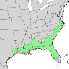 Swamp laurel oak grows from coastal Virginia to central Florida and west to southeast Texas.[6] There are reports of the species growing in Pennsylvania and New Jersey, but these probably represent introductions.[7]