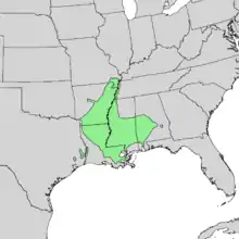 It is native to the south-central United States primarily in the lower Mississippi River Valley in Louisiana, Arkansas, Mississippi, Alabama, and western Tennessee. There are additional populations in eastern Texas, southeastern Oklahoma, southeastern Missouri, far western Kentucky, and the southernmost tip of Illinois.[9]