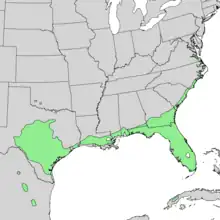 Live oak can be found in the wild growing and reproducing on the lower coastal plain of the Gulf of Mexico and lower East Coast of the United States. Its native range begins in southeast Virginia, and then continues south in a narrow band through North Carolina along the coast to the interior South Carolina coast, where its range begins to expand farther inland. The range of live oak continues to expand inland as it moves south, growing across southern Georgia and covering all of Florida south to the northernmost Florida Keys. Live oak grows along the Florida panhandle to Mobile Bay, then westward across the southernmost two tiers of counties in Mississippi. Live oak grows across the southern third of Louisiana, except for some barrier islands and scattered parts of the most southern parishes. Live oak's range continues into Texas and narrows to hug the coast until just past Port Lavaca, Texas.[9]