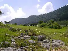 The word Querétaro was voted by 33,000 participants as "the most beautiful word in the Spanish language", before being approved by the Instituto Cervantes.[10][11] In Pre-Columbian terminology, Querétaro literally means "the island of the blue salamanders."[12] Nevertheless, other scholars suggest that it can mean "place of the reptiles" or "place of the giant rocks."[13]