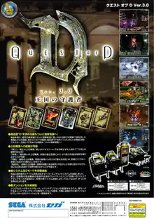 Quest of D[1] is an arcade game developed by Sega AM2 and published by Sega on the Chihiro arcade board. It is the fifth trading card arcade game by Sega, following World Club Champion Football, Mushiking: The King of Beetles, The Key of Avalon and Love and Berry: Dress up and Dance!. It is an action-role playing game in a dark fantasy setting and is online enabled similar to previous AM2 titles Virtua Fighter 4 and Sega Network Taisen Mahjong MJ.[2]