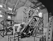 In the early part of the twentieth century, the shafts at Quincy Mine were increasing in depth at a prodigious rate as the company pushed farther underground in search of copper. Between 1905 and 1920, the depth of the principal shafts increased from 5000 feet to over 7000.[5] The requirements to lift rock to the surface from ever-increasing depths severely strained the capabilities of the company's mine hoist equipment.[6] By 1916, the hoist servicing the number 2 shaft had reached its depth limit.[7] Rather than abandon the shaft or eke out a little more depth by retrofitting the existing hoist, Quincy hired the Nordberg Manufacturing Company and Bruno V. Nordberg[2] to design a new hoist engine[7] at a cost of $160,000.[8] It would be the largest mine hoist in the world.[3][7]