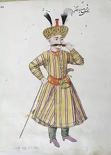 The qurchis were theoretically enlisted from the Qizilbash tribes and were paid by money taken from the royal treasury. The qurchis lived off the land handouts and fees that were given to them by the shah.[4] During the early Safavid period, the qurchis were all from the same tribe, but that later changed. They numbered 3,000 under the Ismail I at the Battle of Chaldiran, but were reduced to 1,700 after the battle, and then later to 1,000, after Ismail had "done away with 700 of them."[5] They numbered 5,000 under Tahmasp I (r. 1524–1576).[6][7]