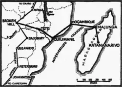 The first airmail flight between Tananarive and Broken Hill in Northern Rhodesia took place on 29 July 1934.[2] The flights operated via Majunga, Ilha de Moçambique, Quilimane and Tete, where they connected with the Imperial Airways service between Cape Town and Cairo.[1] The once-weekly flight carried 115 to 130 lb (52 to 59 kg) of mail, and reduced mail delivery times between Madagascar and Europe to 10–15 days.[1]