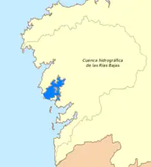 The Ría de Arousa is a ria, a saline estuary, that forms a firth situated on Galicia, Spain. It is one of the five Rías Baixas. The Ría de Arousa estuary is the largest of the estuaries of Galicia. It is part of the Rias Baixas and is located between the estuary of Muros and Noia to the north and the Pontevedra estuary to the south. The peninsulas of Barbanza, in the province of A Coruña, and O Salnés, in the province of Pontevedra, are those who define their coasts on the north and south, respectively. Ría de Muros and Noia (es, gl) is located in north.
