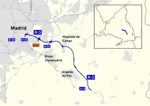 The R-3 motorway (Autopista Radial R-3) is a Spanish motorway connecting Madrid (M-30), Arganda del Rey (A-3) and Tarancón (A-3).
