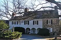 Merestone in New Garden Township, Pennsylvania, built in 1942, is an example of Okie's popular Pennsylvania-farmhouse style.