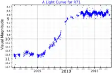 The outburst of R71 lasted from about 1971 until 1977, and it then faded back to about 11th magnitude. Records are incomplete, but a new outburst was observed to begin in 2006 with the brightness increasing beyond any previous observations to magnitude 8.7. The temperature also cooled to record levels around 6,650 K and the luminosity was calculated to have increased significantly.[6] During the rise of this outburst, periodic brightness variations with an amplitude of about 0.1 magnitudes began to be seen.[2]