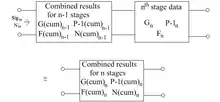 Consider the nth stage in a chain of RF devices. The cumulative gain, noise figure, 1 dB compression point[14][3]: 119 and output thermal noise power for the preceding (n-1) devices are given by Gcumn - 1, Fcumn - 1, Pcumn - 1 and Ncumn - 1, respectively. We wish to determine the new cumulative figures, when the nth stage is included, i.e. the values of Gcumn, Fcumn, Pcumn and Ncumn, given that the nth stage has values of Gn, Fn, P1n for its gain, noise figure and 1 dB compression point, respectively.