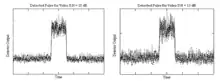 As examples, thumbnails show simulated examples of a detected pulse, in noise, where S:N = 18 dB and 15 dB. As can be seen, if the S:N falls to 15 dB or lower, it becomes difficult to set a threshold level for pulse detection, that is clear of the noise floor, and yet does not result in early termination.