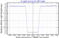 Discovered to be an eclipsing binary in 1979, it has a baseline magnitude of 14.36, dimming markedly every 7.2 hours for an interval of around 10 minutes, due to the total eclipse of the hotter star by the cooler one. Its variability in brightness led to its being given the variable star designation RR Caeli in 1984. There are very shallow secondary eclipses where the white dwarf transits across the red dwarf.[7]